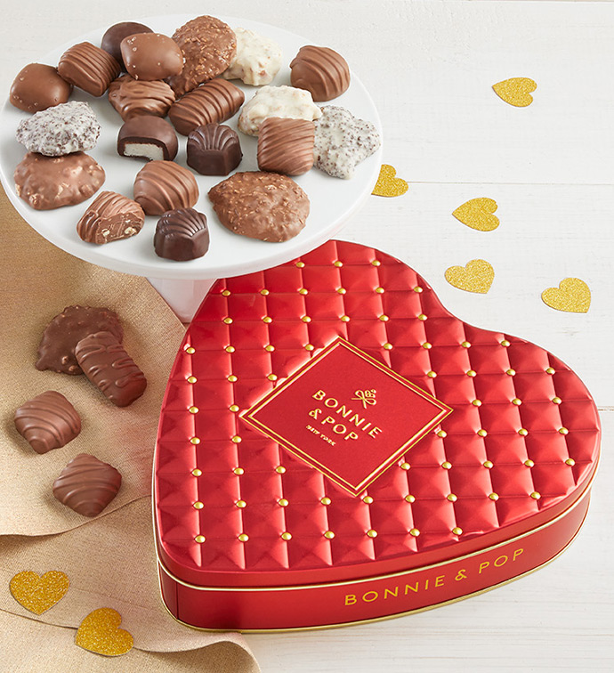 This beautifully crafted red heart-shaped tin makes a perfect and thoughtful gift. Inside, they will discover a handpicked selection of delicious chocolates and chocolate-covered snacks, including rich truffles, creamy caramels, and crunchy chocolate-dipped pretzels. Each bite is made to indulge and delight. No need for wrapping—this tin is ready to gift with its eye-catching design and premium contents. It's an effortless way to show your love with something both beautiful and indulgent.