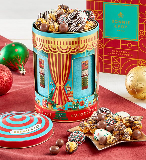 Add a touch of whimsy to your holiday décor and have plenty of snacks to enjoy with these nutcracker-shaped gift tins. Each one is filled with an array of scrumptious treats, including dark chocolate peppermint popcorn, peanut brittle, chocolate-covered sandwich cookies, and more. Keep them stocked all season long with your favorite goodies and use the nutcrackers’ hats as dishes to serve when company is over.