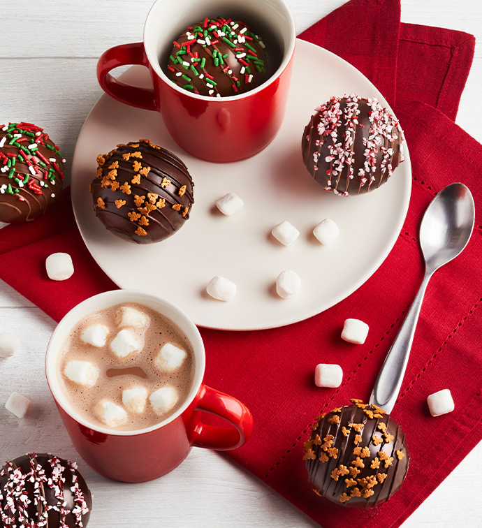 Drinking hot chocolate has never been more fun and festive than with Hot Cocoa Bombs! Drop a sprinkled cocoa bomb into a big mug, slowly pour hot milk over the top, and watch the luscious flavors melt and unfold, revealing hidden mini marshmallows and swirls of hot chocolate. Serve this wondrous wintertime treat to family and friends or send as a gift this holiday season. Choose Between six or four hot cocoa bombs.