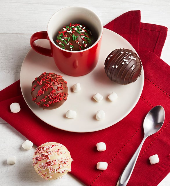Drinking hot chocolate has never been more fun and festive than with Hot Cocoa Bombs! Drop a sprinkled cocoa bomb into a big mug, slowly pour hot milk over the top, and watch the luscious flavors melt and unfold, revealing hidden mini marshmallows and swirls of hot chocolate. Serve this wondrous wintertime treat to family and friends or send as a gift this holiday season. Choose Between six or four hot cocoa bombs.