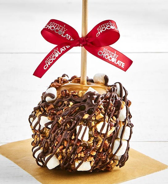This perennial favorite caramel apple takes the classic flavor combination of rocky road and brings it to a whole new level with the addition of dark chocolate. It’s an extra large tart Granny Smith apple dipped in caramel and milk chocolate, then rolled in a mouth-watering mix of pecans and marshmallows and drizzled with dark chocolate.