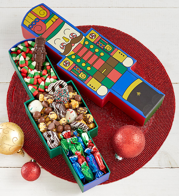 Celebrate the season with this festive soldier-shaped tin overflowing with holiday-themed chocolate and candy delights. Inside, you'll find milk caramels, a savory-sweet holiday jingle mix, chocolate peppermint bark, and nostalgic holiday candy corn. This compact yet joyful basket is perfect for seasonal gifting or cheery snacking.