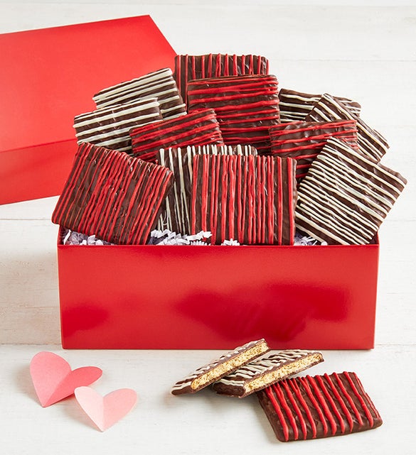Delight the dark chocolate lover in your life with this luxurious take on a timeless treat. Crisp graham crackers are coated in rich, velvety dark chocolate and artfully drizzled for a touch of elegance. Individually wrapped for easy sharing, these irresistible bites are perfect alongside a cup of coffee, chilled glass of milk, or after-dinner aperitif. Presented in a Simply Chocolate signature gift box, this dozen makes an unforgettable gift to celebrate the season of love.